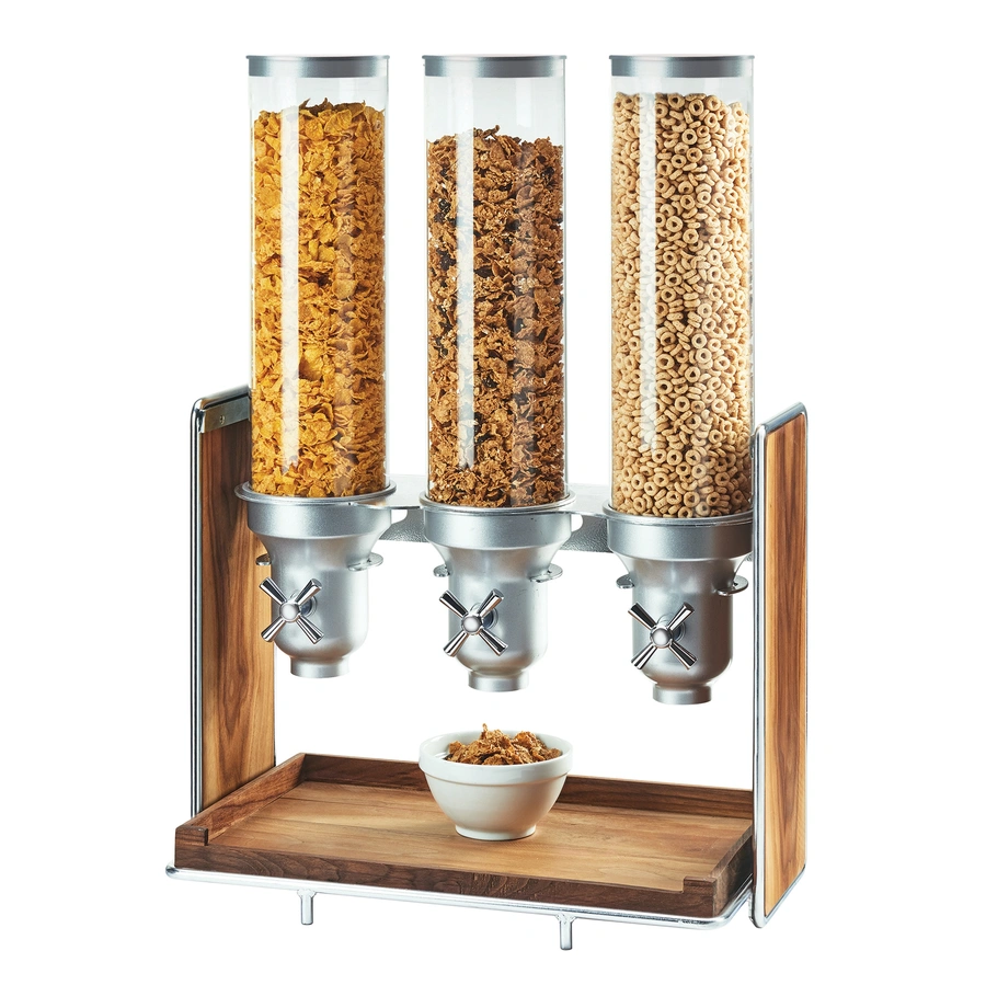 Cal-Mil 3720-49 (3) 4-1/2L capacity cylinders Mid-Century Cereal Dispenser - Dispenser, Dry Products, (3) 4-1/2L capacity cylinders, 19-1/2"W x 12"D x 28-1/2"H, turn & serve mechanism, plastic cylinders, walnut with chrome frame