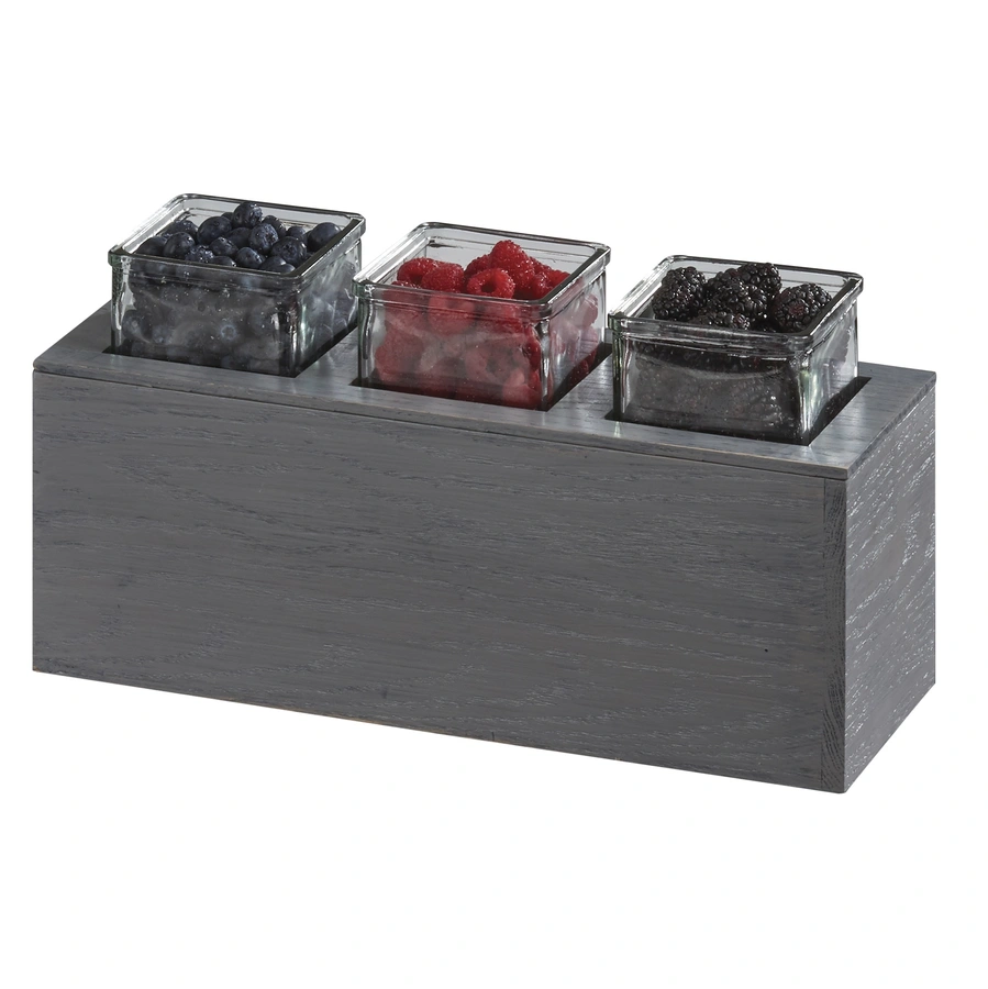Cal-Mil 3836-3-83 15-3/4"W x 5-1/2"D x 8-3/4"H Ashwood Action Station Jar Unit - Bar Condiment Holder, 15-3/4"W x 5-1/2"D x 8-3/4"H, rectangular, includes: (3) glass jars & cold puck, oak wood, ash gray