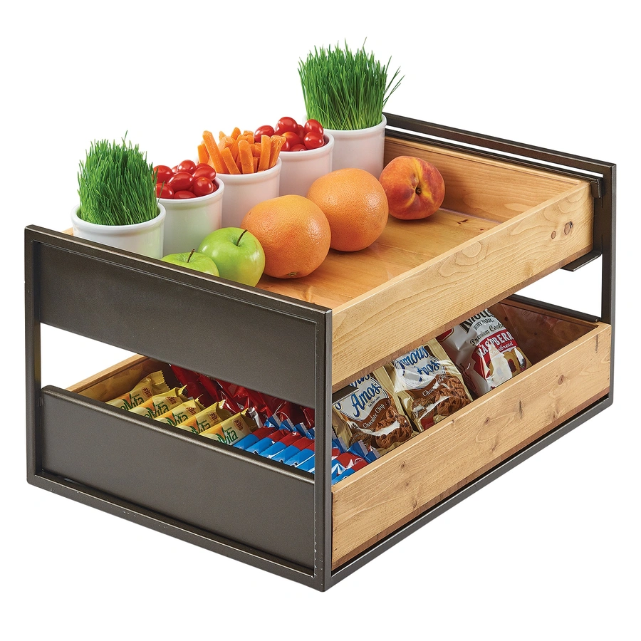 Cal-Mil 3920-84 21-3/4"W x 15-1/2"D x 11-1/2"H Sierra Drawer Display - Display Stand, Tiered, 21-3/4"W x 15-1/2"D x 11-1/2"H, (2) rustic pine drawers with liners, metal frame, bronze finish,