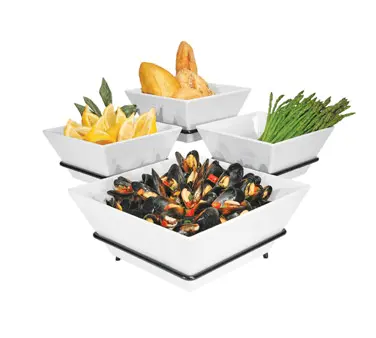 Cal-Mil SR1010-13 19"W x 19"D x 11"H Gourmet Quad Bowl Display - Display Stand, Tiered, 19"W x 19"D x 11"H, 3-tier, square, (3) 8" and (1) 12" melamine diamond bowls, metal wire frame