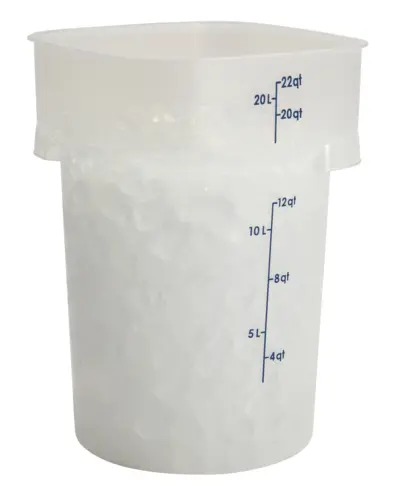 Crafted from heavy-duty polypropylene, this container is built to resist stains, cracks, and odors, ensuring reliable performance in even the busiest kitchen environments. The translucent body allows for quick identification of contents, while bold, molded-in graduations make it easy to track inventory, measure ingredients, and rotate stock efficiently. With its 22-quart capacity, it provides ample storage for bulk ingredients, fresh produce, prepared foods, or liquids.