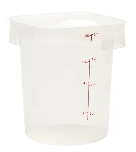 Crafted from durable polypropylene, the Cambro FreshPro CamRounds™ container is built to withstand daily use in high-volume kitchens. Its sturdy construction resists cracks, stains, and odors, delivering reliable performance and long service life. The translucent body makes it easy to quickly identify contents, while bold, molded-in graduations allow for accurate portioning, inventory management, and food rotation.