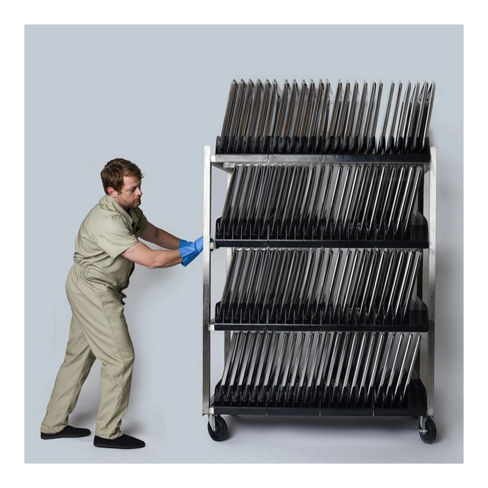 The Vented Sheet Pan Drying Rack is designed to promote faster, more effective drying of sheet pans than traditional sheet pan drying racks.