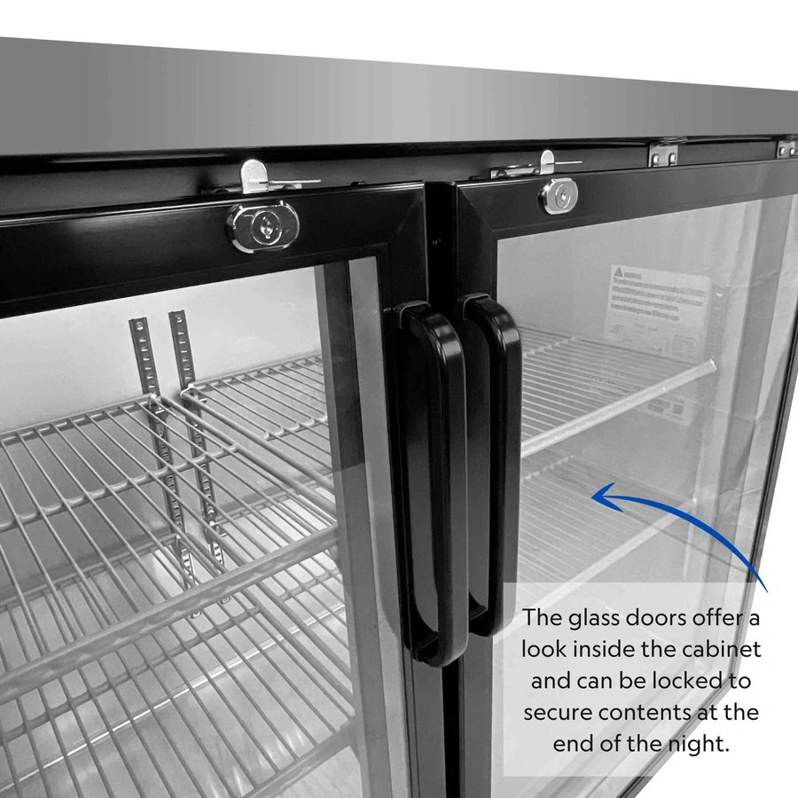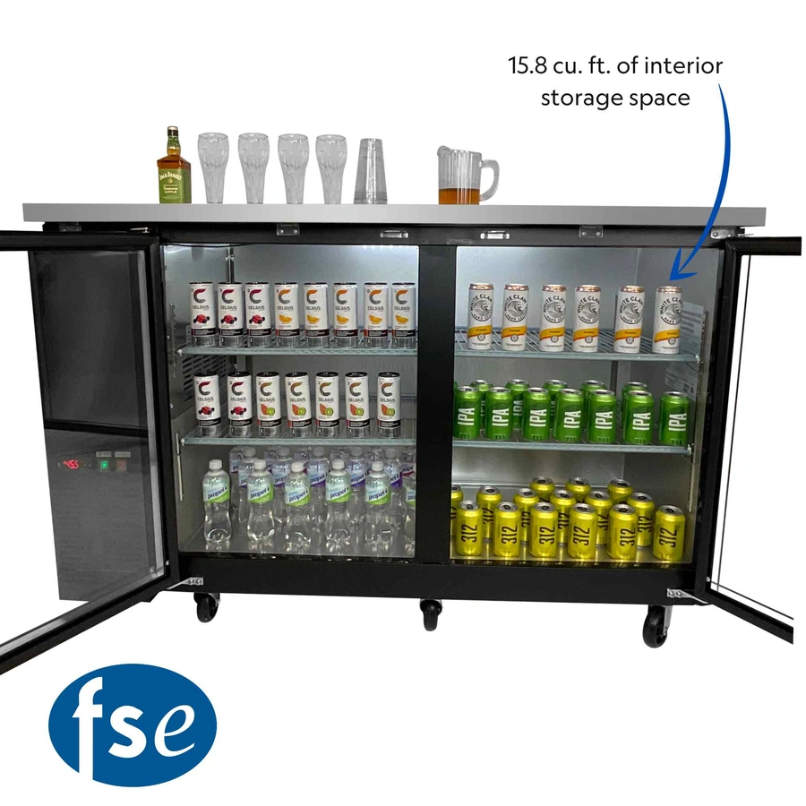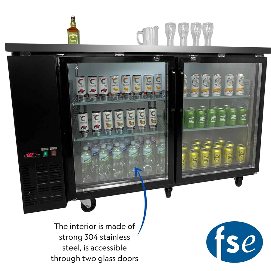 FSE 60 Inch Narrow Bar Back Refrigerator Cooler, Counter Height with Two Swing Glass Doors, LED Lighting, Stainless Steel Top, Black, 115v,MBB-6024G