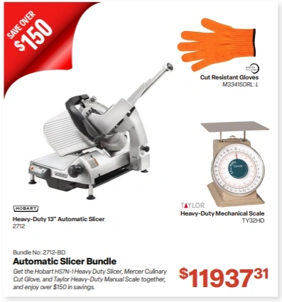 Enhance your slicing precision and kitchen efficiency with the Hobart HS7N-1 Slicer Bundle. This exclusive package includes the Hobart 2712 Manual Heavy Duty Slicer, a Mercer Culinary Cut Glove, and a Taylor Heavy-Duty Manual Scale, giving you a complete solution for safe and accurate food prep—all while saving over $150.