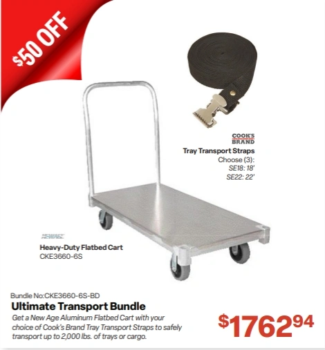 Get strength and security in one package with the New Age CKE3660-6S Heavy Duty Flatbed Cart Bundle. This bundle includes the New Age Heavy Duty Flatbed Cart and your choice of three Cook’s Tray Transport Straps (SE18 or SE22) in either 18' or 22' lengths—all for $50 in savings, while supplies last.