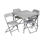 - Consists of 4 folding chairs and 36" x 36" fold in half table